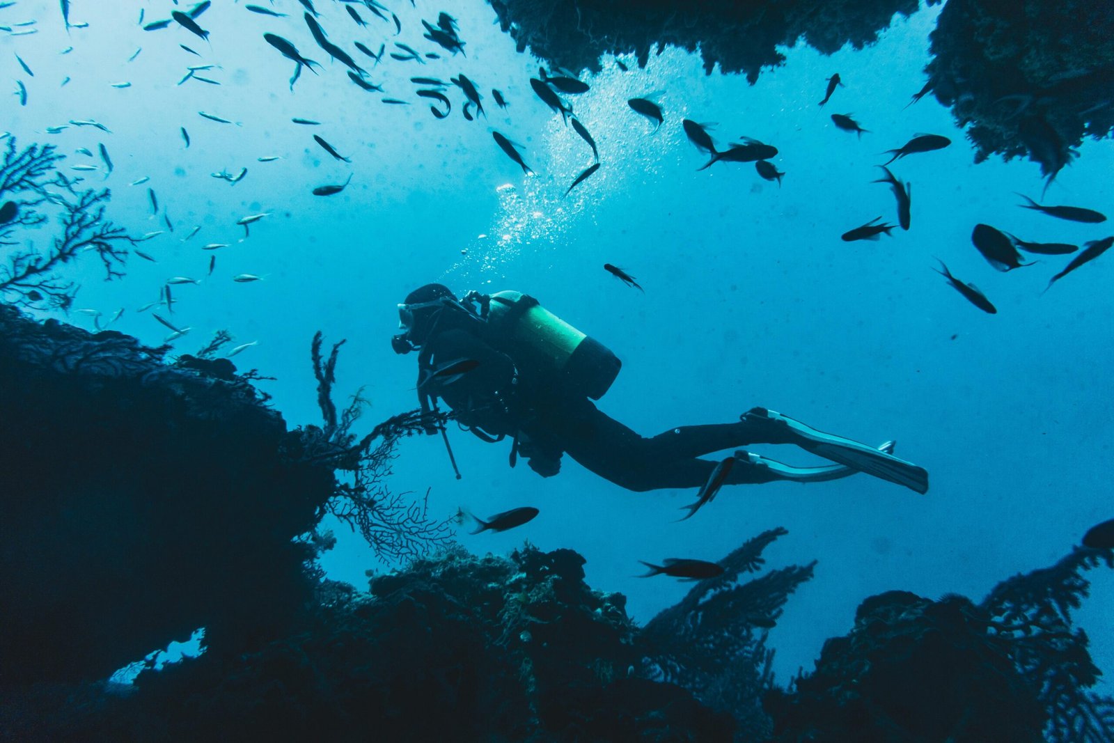 The Dahab Canyon is the classic canyon, an essential dive for all fanatics of caves and cavern diving. The Canyon is itself quite a phenomenon. Up to 10 meters high and virtually closed over at the top, it snakes its way up from the depths, to emerge in a large glassfish filled coral dome. The Canyon dive site offers an easy entry and exit point through a shallow, sandy lagoon. This leads out to beautiful coral gardens inhabited by Butterflyfishes, Unicornfishes, Octopus, Pufferfish and of course Red Sea Anthias, which can only be fully explored after several visits. The Canyon itself is positioned about five minutes north-east from the exit of the lagoon. The entry to the Canyon is done through it largest point at about 20 meters. The progression through the Canyon is easy and the light effect caused by the sun rays is fantastic.