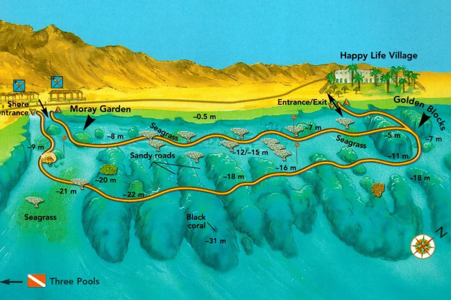 This site is accessible by car from Dahab in about ten minutes. Getting into the water is fairly easy and is done from the beach. After crossing an area of sand then a seagrass, we arrive at a succession of line of corals starting from the beach and sinking towards the sea. the abundance of corals makes it a very colorful site full of marine life. The return to the exit is through a shallow coral garden in which we regularly encounter geometric moray eels