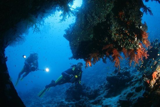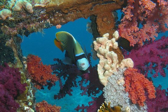 At about 28m, divers can enter the wreck through an opening in the hull. Sunlight streams through the broken sides, illuminating the boilers, ladders, and emergency valves that tell the story of this old vessel. Inside, schools of glassfish shimmer in the light, while a massive resident moray eel often makes an appearance.