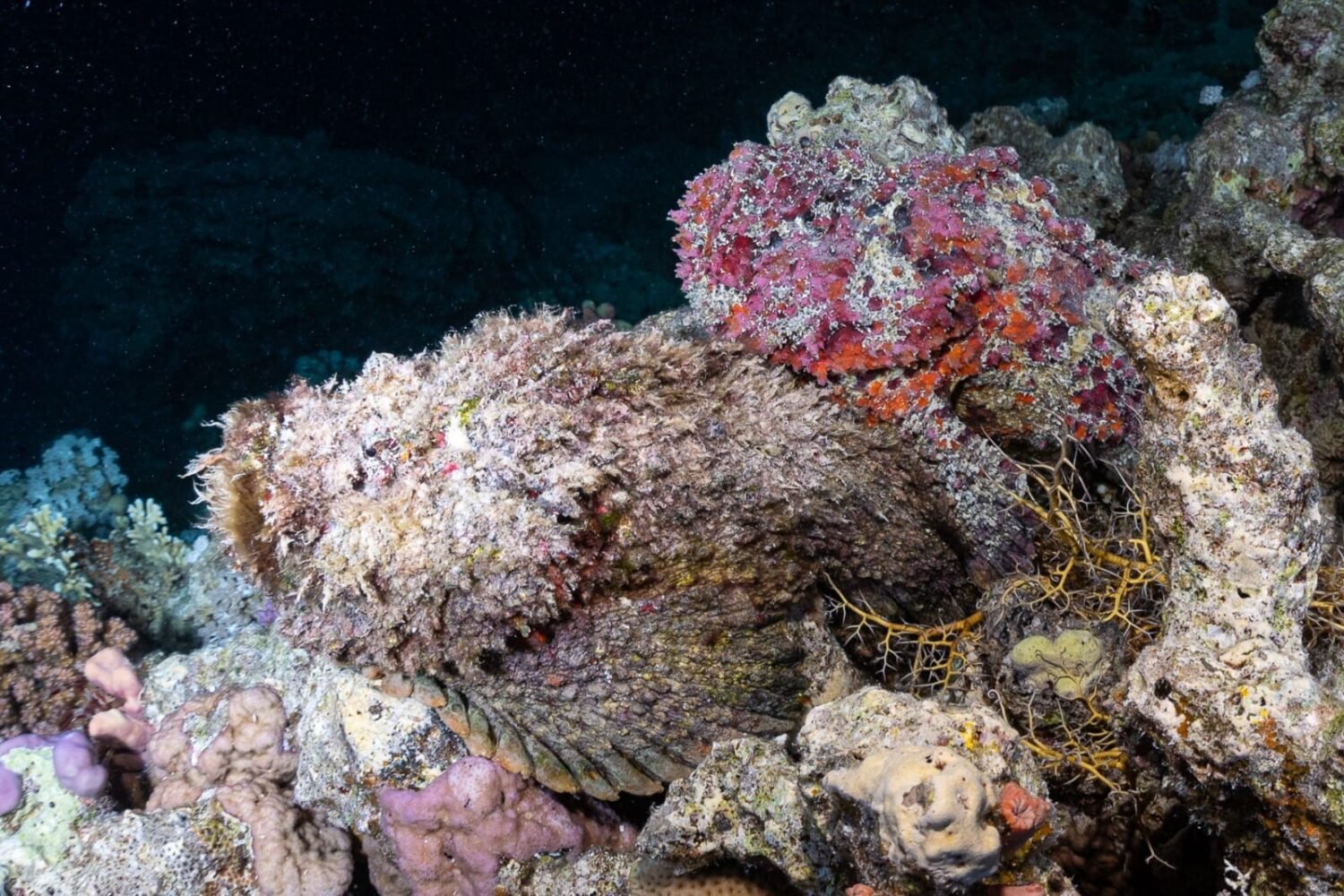 Continuing in a southeast direction, with the sandy bank on your right, the dive takes you to a magnificent reef wall adorned with vibrant hard corals. Among them, the striking black coral trees emerge dramatically from the wall, adding a mystical touch to the site. This wall also marks the starting point for the renowned Shark Observatory dive.