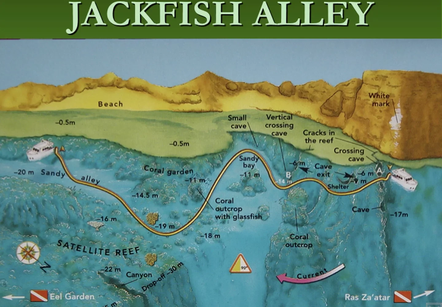 The signature feature of the site: a peaceful sandy channel bordered by colorful coral gardens. Schools of fusiliers sweep overhead, while hard and soft corals line the edges. Keep an eye on the open blue for passing jackfish, the site’s namesake.
